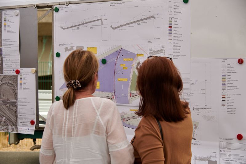 - Für die Durchführung der Maßnahme sind drei Baustellenzufahrten vorgesehen. Die Hauptzufahrt erfolgt über die schon vorhandene Baustraße entlang der Autobahn. Eine weitere Zufahrt erfolgt im Südwesten von der Oeserstraße durch den Niedwald und im Norden entlang der Wiesenfeldstraße. Die Fuß- und Radwegeverbindungen werden um das Baufeld herumgeführt, hierzu werden in Abhängigkeit von der jeweiligen Bauphase Verkehrsphasenpläne erstellt.
